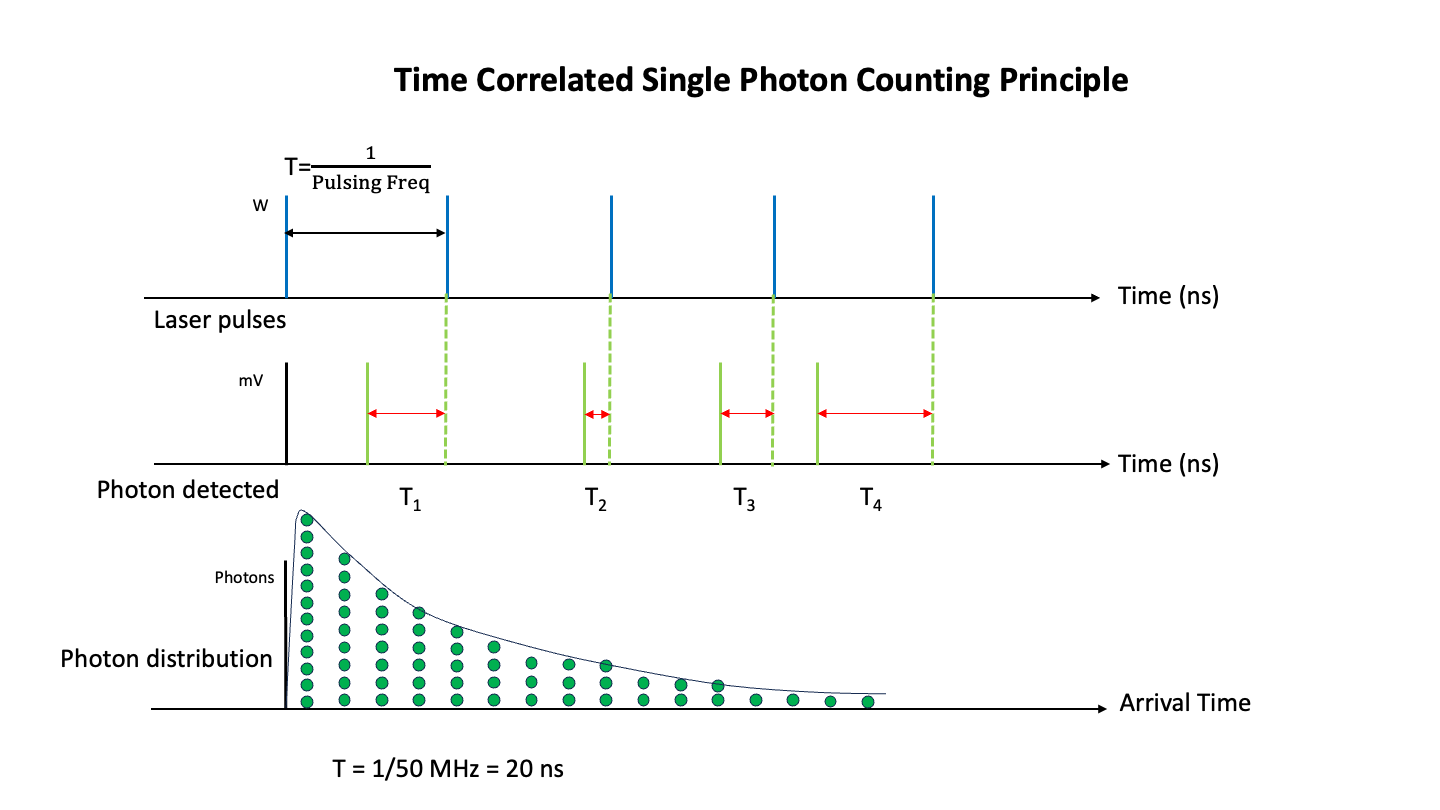 The general principle is to derive excited state lifetime from the histogram of emitted photons, and the histogram is built up from numerous excitation-emission cycles over an experimental time period. To achieve TCSPC, a femtosecond- or picosecond-pulse laser and a ultra-fast detector are necessary components of the hardware setup. Each photon that is detected has a time-tag associated with it. This time-tag is measured as illustrated in the diagram below. This histogram represents the photon emission probability of a particular molecule in a certain molecular state in a certain microenvironment. The fluorescence lifetime derived from this histogram reflects the molecular state. Changes in the molecular state, such as a change to the molecular structure due to binding to or dissociation from a ligand or due to changes to pH/redox state, can lead to a detectable change in the fluorescence lifetime.